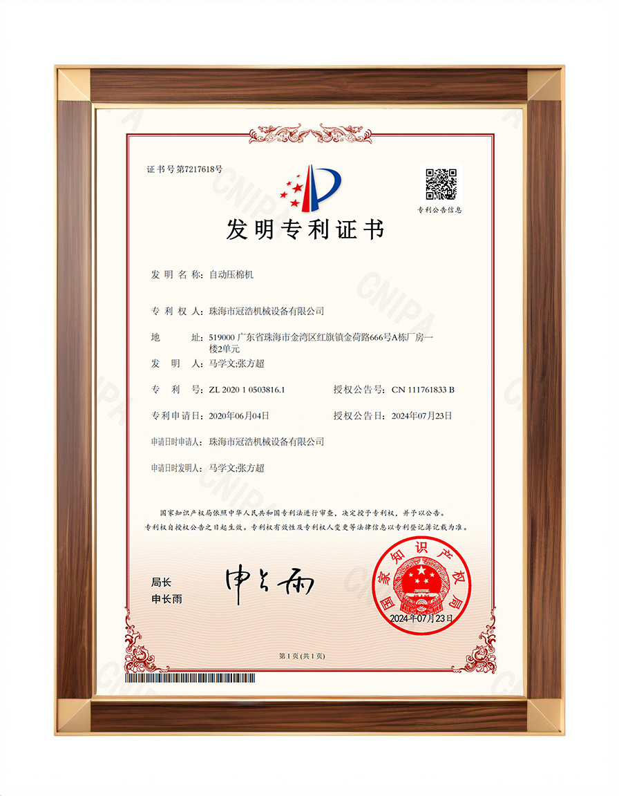 近日,冠浩公司宣布其自主研發(fā)的自動(dòng)壓棉機(jī)獲得了國(guó)家發(fā)明專利證書。這一創(chuàng)新成果標(biāo)志著公司在智能制造領(lǐng)域取得了重大突破,將對(duì)生物組培加工行業(yè)帶來(lái)深遠(yuǎn)影響。