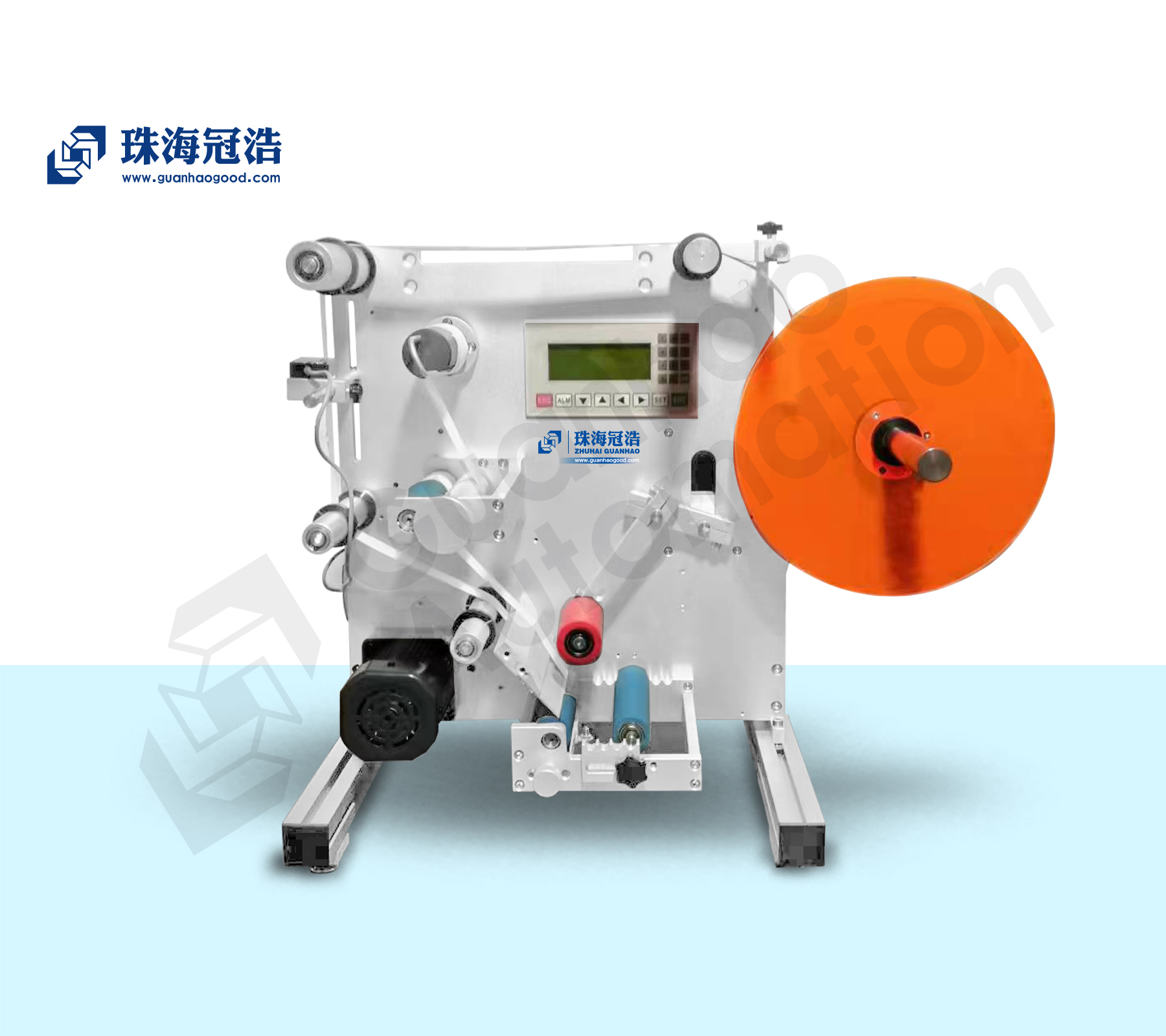 核心工作原理:傳感器檢測到產(chǎn)品到位或腳踩發(fā)出產(chǎn)品到位信號,在適當位置送出一張標簽貼在產(chǎn)品預定位置上,產(chǎn)品轉動中貼標和覆標,標簽貼完并覆好在產(chǎn)品上,一張標簽的貼附動作完成;